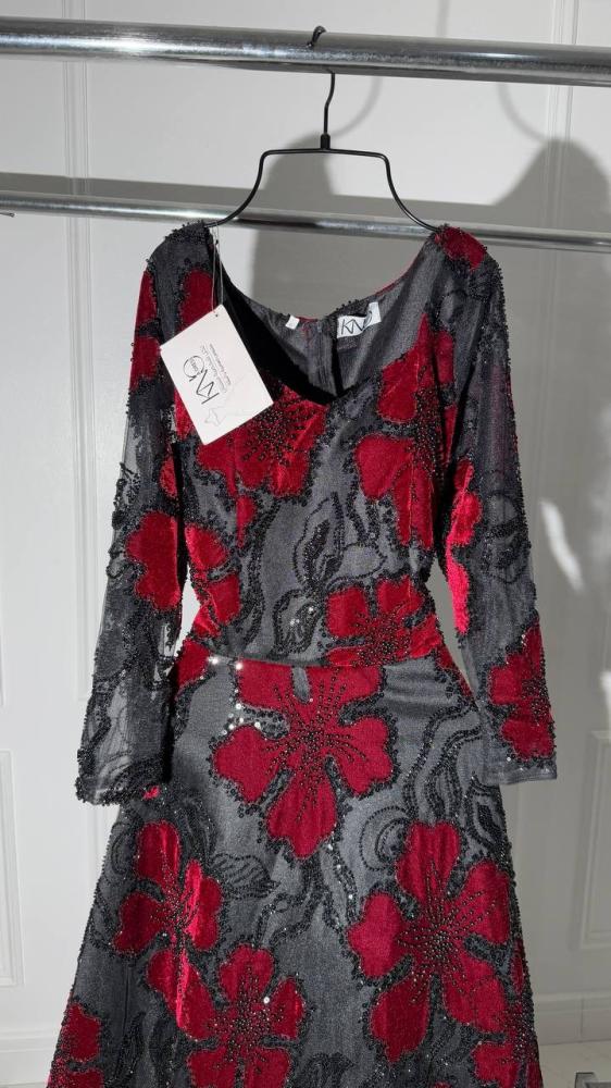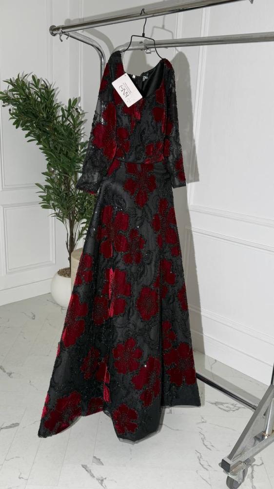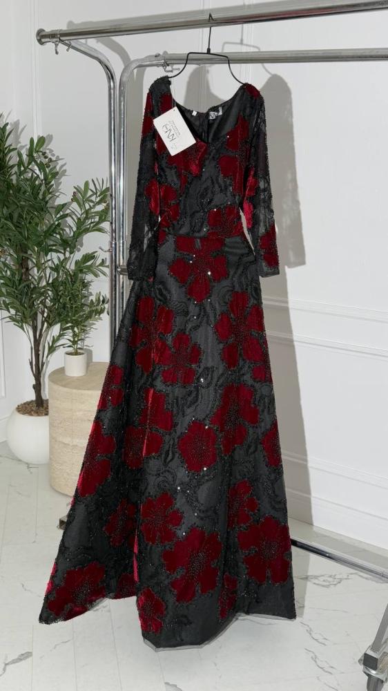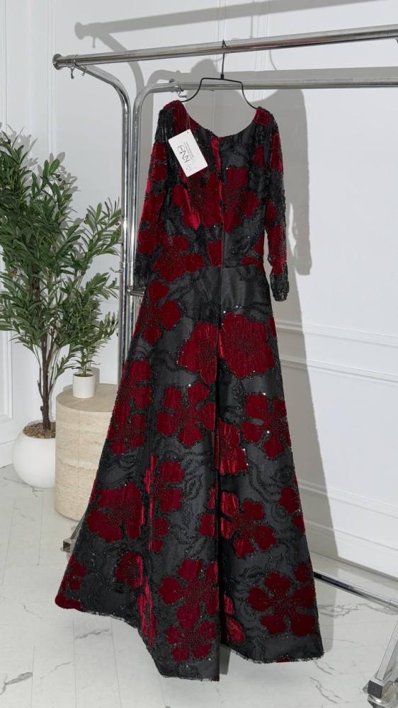 فستان فاخر بطول 60 إنش مصنوع من قماش الكلفة المزين بالمخمل والخرز اللامع، مع جيبون يضيف حجماً وأناقة فخمة للتصميم، مثالي للمناسبات الراقية.