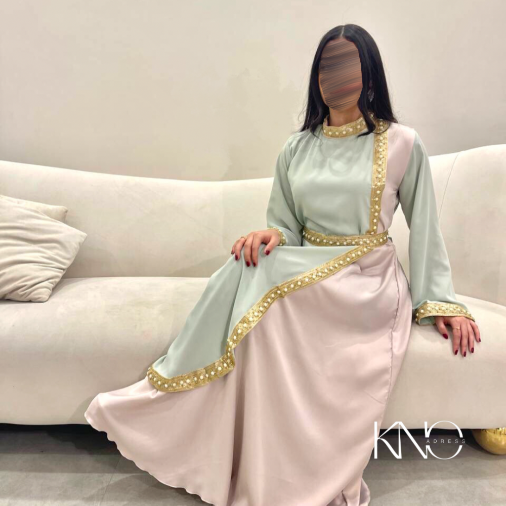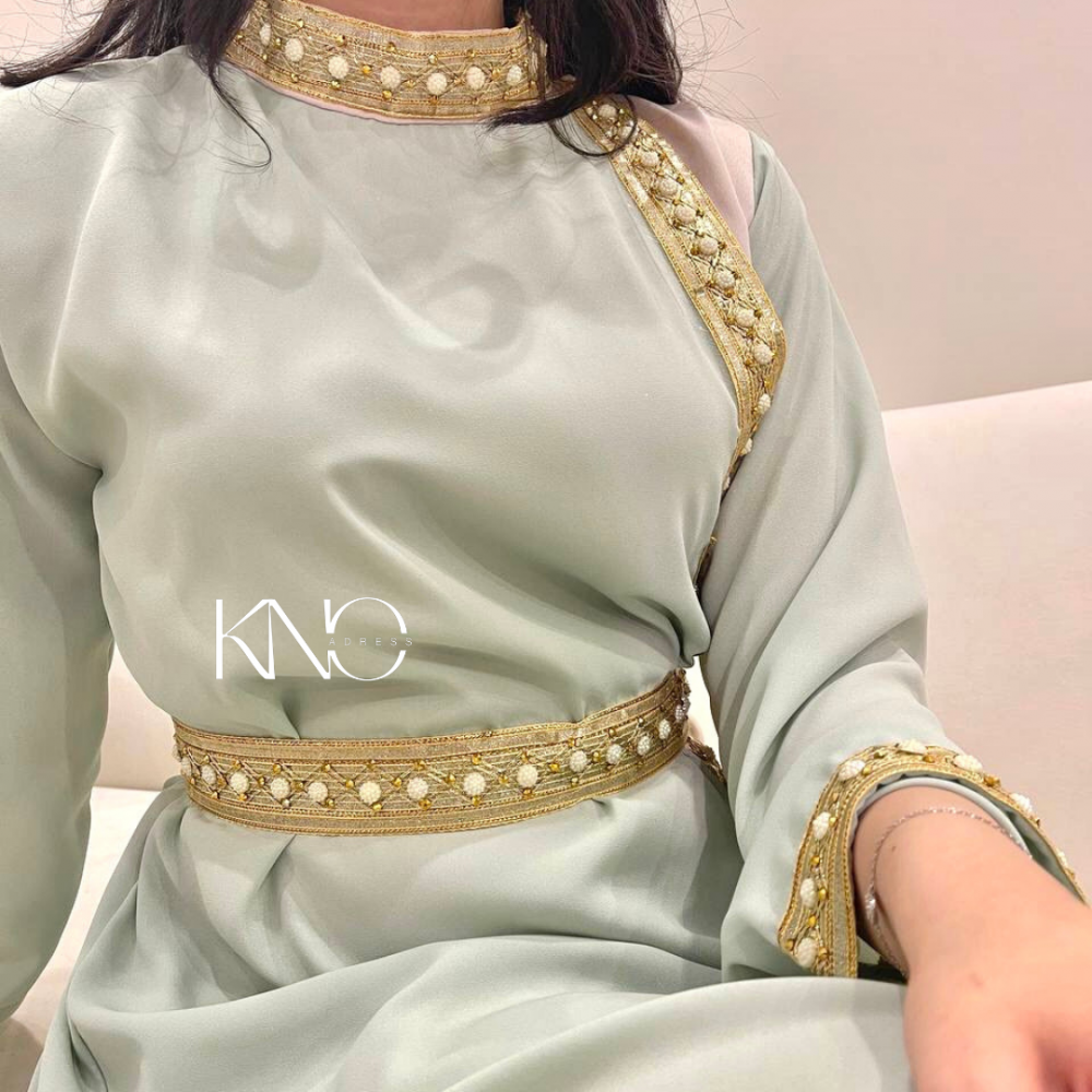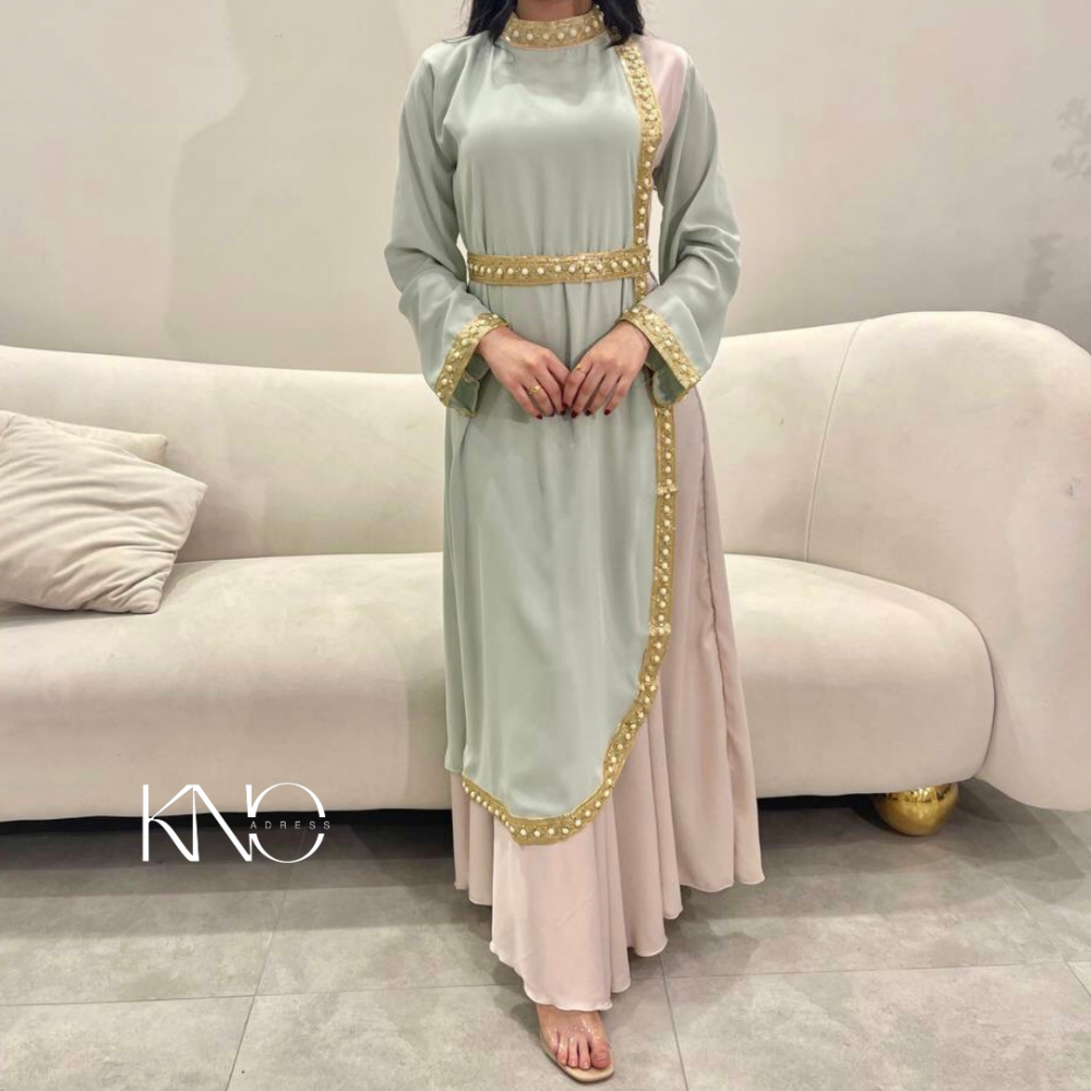 جلابية بقماش الحرير مزينة بشريط ذهبي مطرز بخيوط ذهبية و فصوص بيضاء مع الحزام .