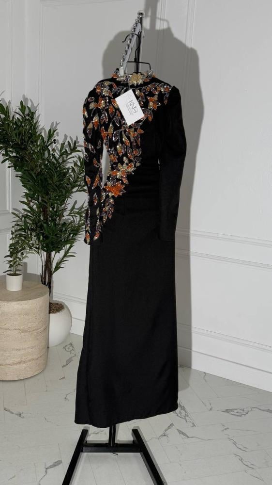 فستان السهرة الأسود هذا يمنحك حضورًا مهيبًا بتفاصيله المطرّزة وألوانه الدافئة التي تعكس فخامة التصميم وأناقة الذوق. إنه الخيار المثالي لكل من تبحث عن الجمال الكلاسيكي الممزوج بالعصرية في كل مناسبة.