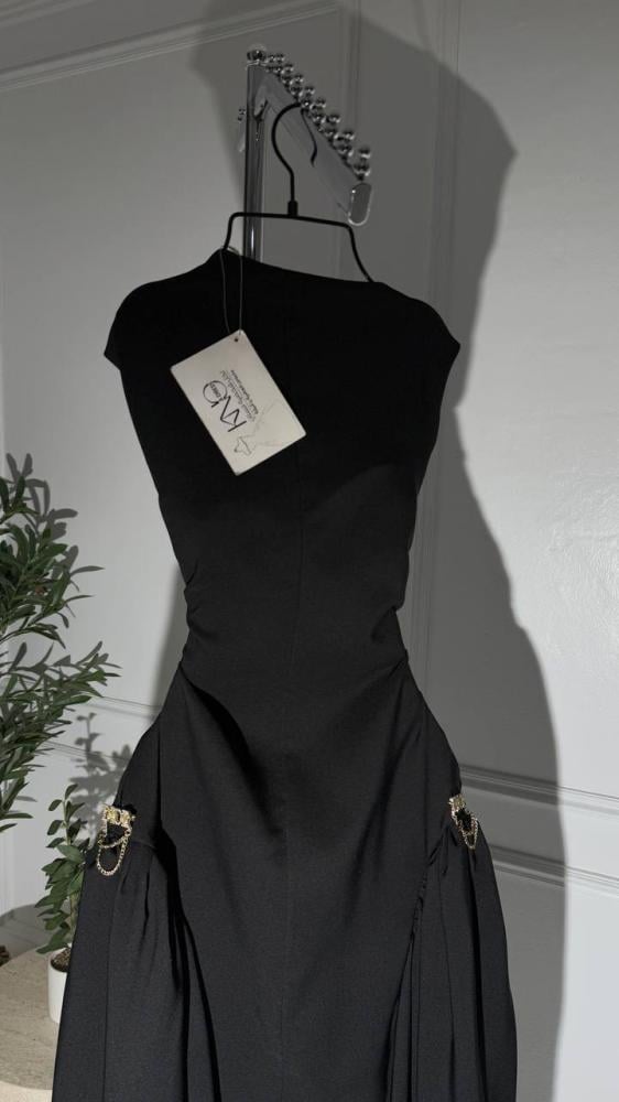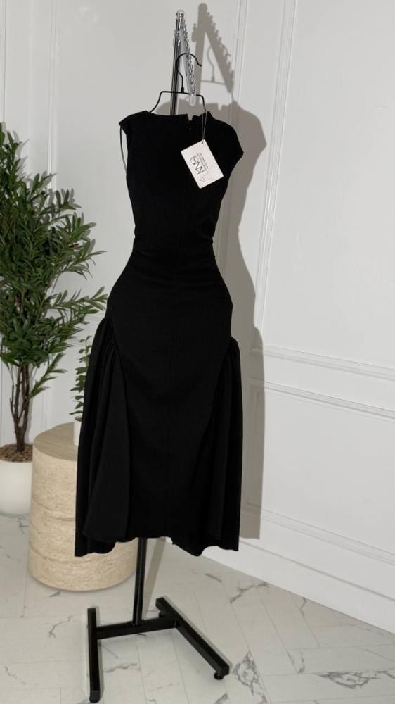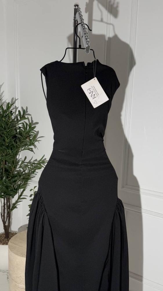 • فستان أسود أنيق بتصميم ضيق عند الخصر قليلا، مما يمنحه مظهرًا كلاسيكيًا جذابًا.