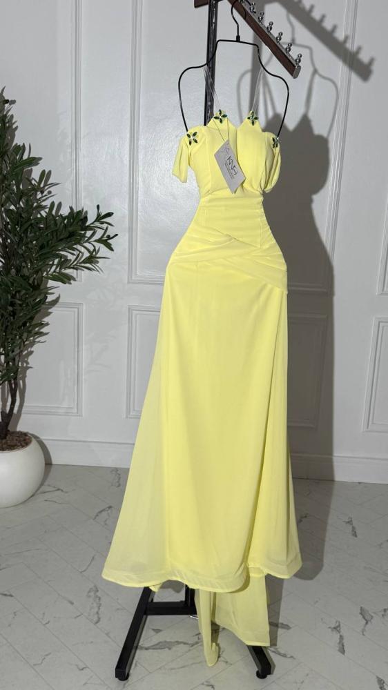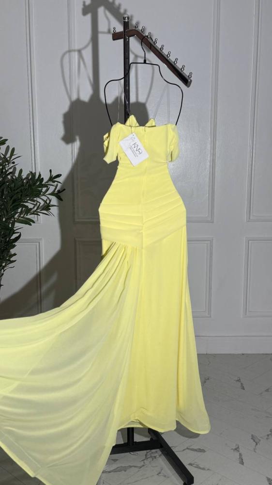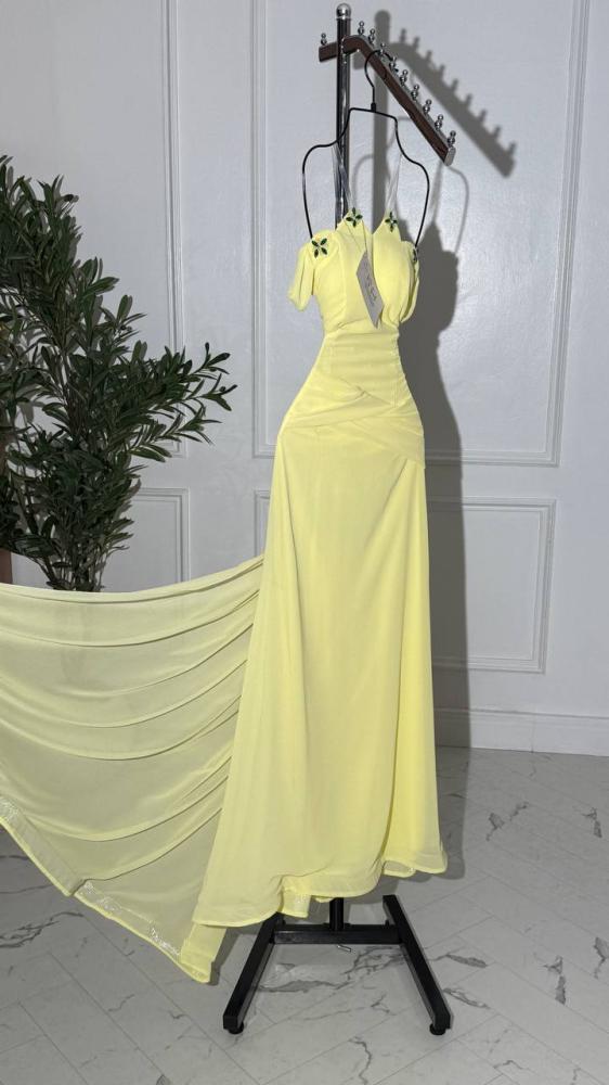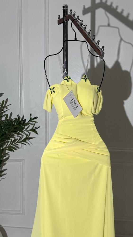 فستان أصفر أنيق ينبض بالحيوية، يتميز بقصة ضيّقة تُبرز جمال القوام، وتصميم كتفين مكشوفين مع أكمام منسدلة تضيف لمسة ناعمة. يزدان بتطريز ناعم على الأكتاف ولمسة درابية جذابة عند الخصر، مع تنورة شيفون منسدلة تمنحه حركة ساحرة وأناقة فريدة.