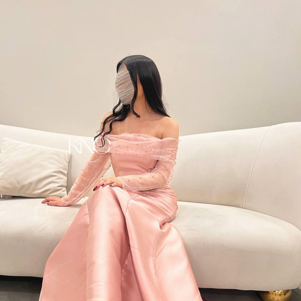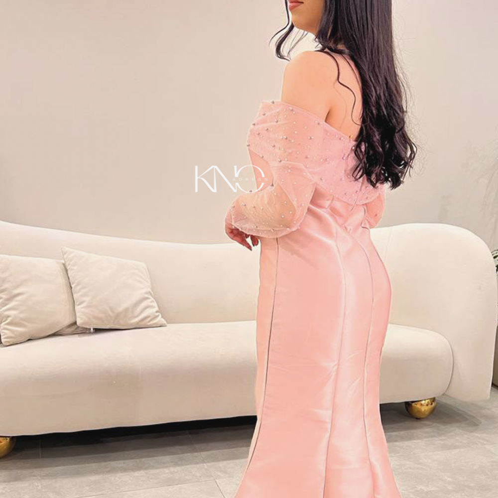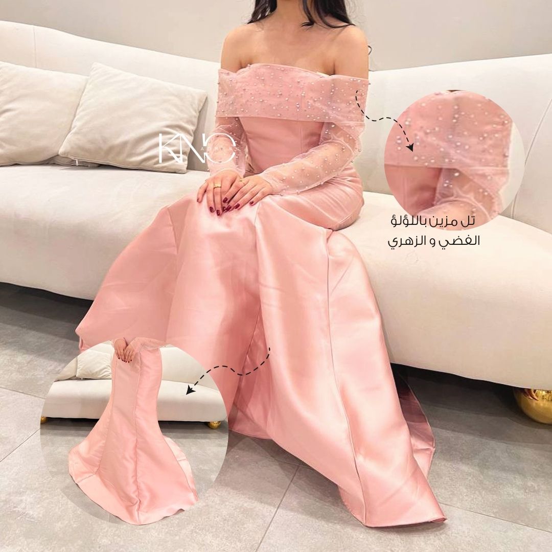 الفستان الزهري الرائع لمناسبات الافراح بالتول على الصدر و الأكمام المزين بالؤلؤ متوفر بأربع الوان.