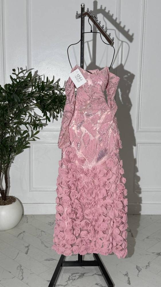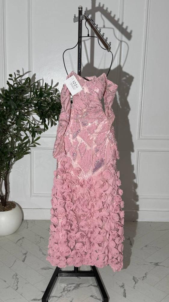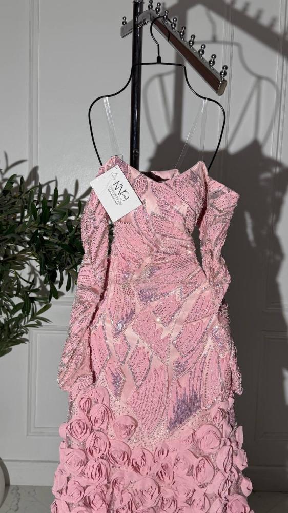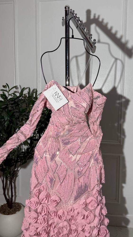• فستان وردي فاخر مزين بالشك اللامع وتطريز يدوي أنيق، تتناثر عليه ورود ثلاثية الأبعاد تمنحه جمالًا استثنائيًا ولمسة ملكية راقية.
