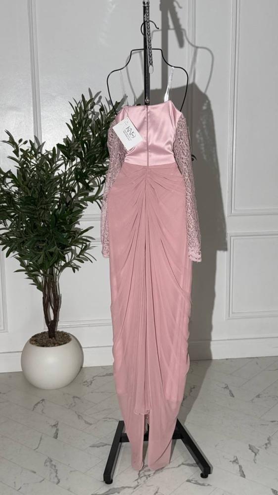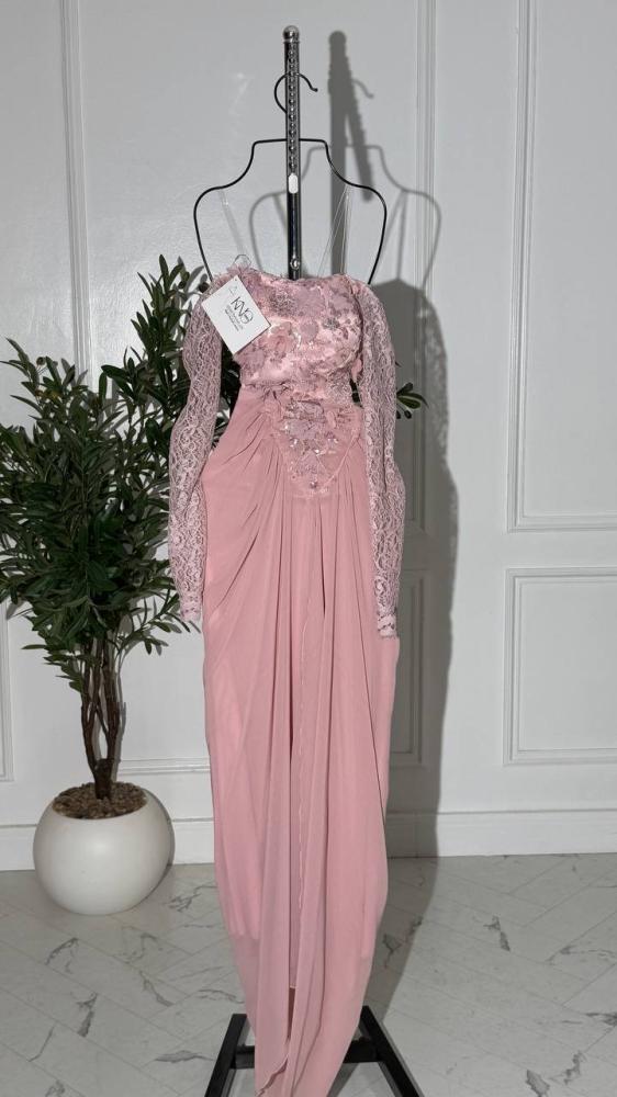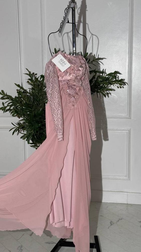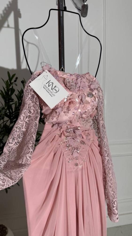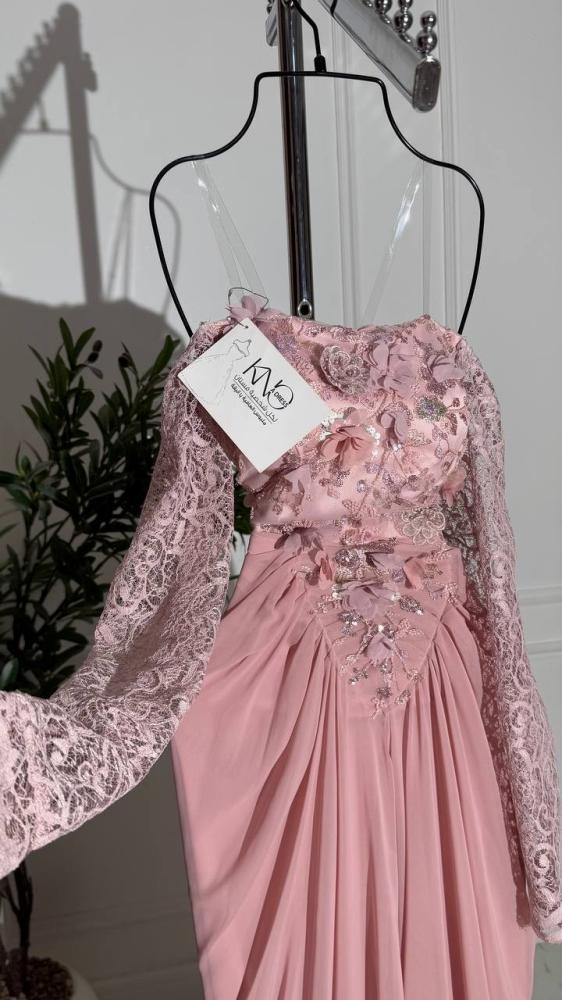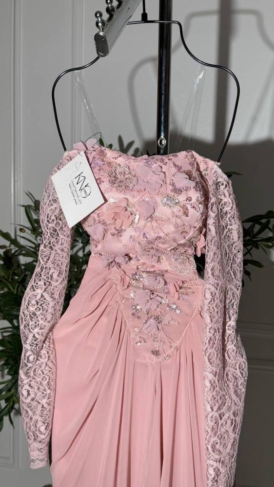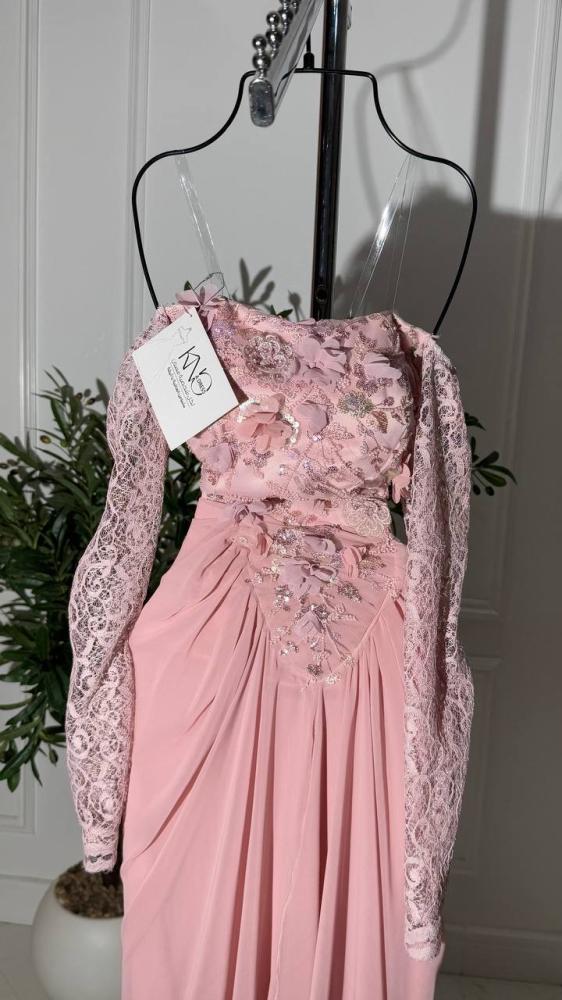فستان أنيق وفاخر مصنوع من خامة ورود دقيقة، يتميز بأكمام دانتيل شفافة تضيف لمسة رومانسية، وتنورة من جورجيت خفيفة تمنح الحركة والسلاسة. تصميمه يجمع بين الأنوثة والفخامة، مثالي للمناسبات الخاصة والسهرات الراقية