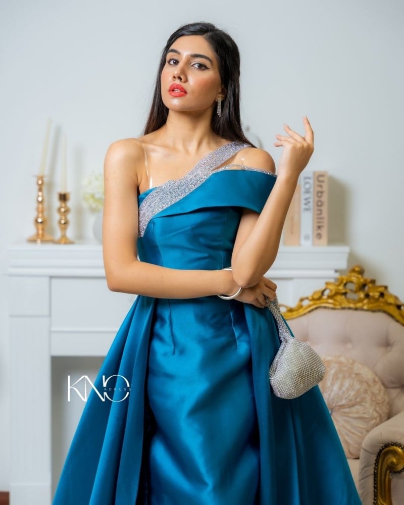 لتكملي إطلالتك بالأزرق النيلي، يمكنك اختيار مجوهرات باللون الفضي أو الأبيض، فهي تكمل الفستان دون أن تطغى عليه. كما تناسبك أحذية وكلاتش بألوان محايدة مثل الأسود أو الرمادي لإضفاء توازن وأناقة على المظهر العام