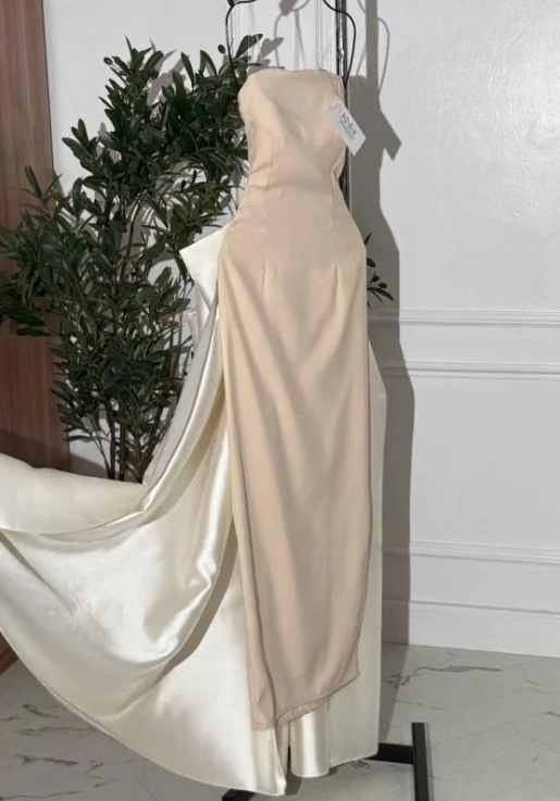 • الجزء الخلفي مزوّد بذيل من قماش الميكادو اللامع بلون بيج ساحر، ينساب بخفة خلفكِ ويُضفي لمسة درامية راقية.