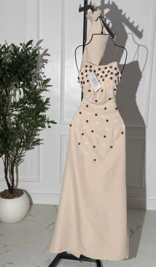 - الفستان يأتي بلون لحمّي بيج فاتح وناعم، يمنحك حضورًا راقيًا وتناسقًا جذابًا مع كافة درجات البشرة.
