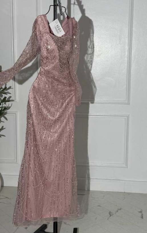 - هو أحد فساتين سهرة ذات الأكمام الطويلة التي تعطي مظهرًا ملكيًا وأنيقًا في الوقت ذاته.