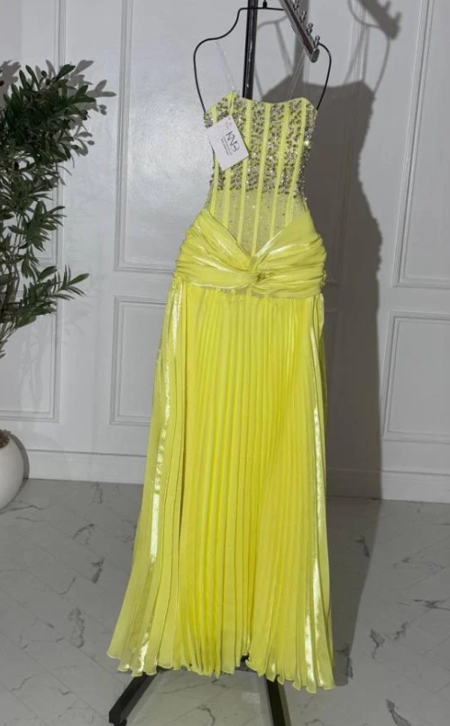 فستان سهرة اصفر لمعة فاخرة مع جورجيت