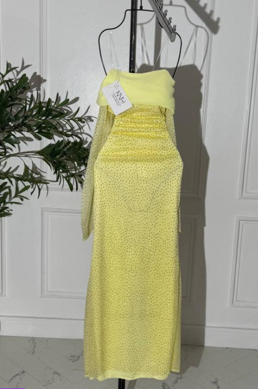 - ستجدين نفسكِ تتألقين بهذا الفستان الكلاسيكي الطويل بلونه الأصفر الباستيل الناعم من خامة الجورجيت مع لمعة.