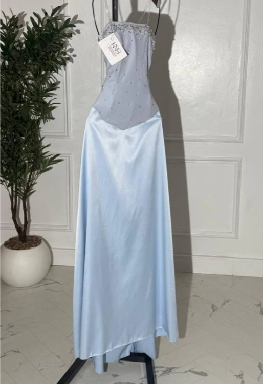 فستان سهرة سماوي طويل مع شك بأكمام مكشوفة