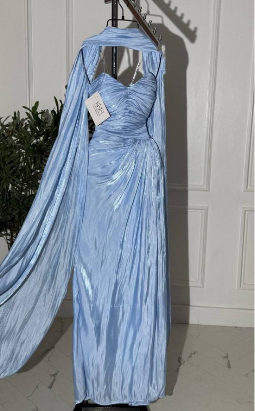 فستان سهرة سماوي شك فاخر مع باربي وشال جورجيت