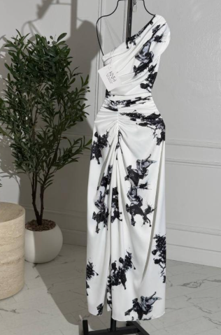يتميز بكتف واحد يضفي لمسة عصرية وأنيقة، مع كسرات متقنة ونقوش فنية بالأبيض والأسود تضيف لمسة فنية تبرز التفرد والجمال.