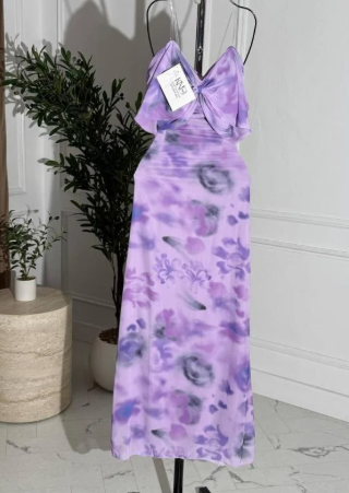 يتميز هذا الفستان بلونه البنفسجي الفاتح الناعم مع نقوش زهرية تضفي عليه لمسة من الحيوية والأناقة، مما يجعله اختيارًا مثاليًا لإطلالة صيفية أنثوية فريدة.