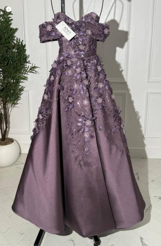 يظهر أمامك فستان سهرة بنفسجي ميكادو مع ورود اوف شولدر يحمل حضورًا آسرًا، بتفاصيل دقيقة تظهر كالتالي: