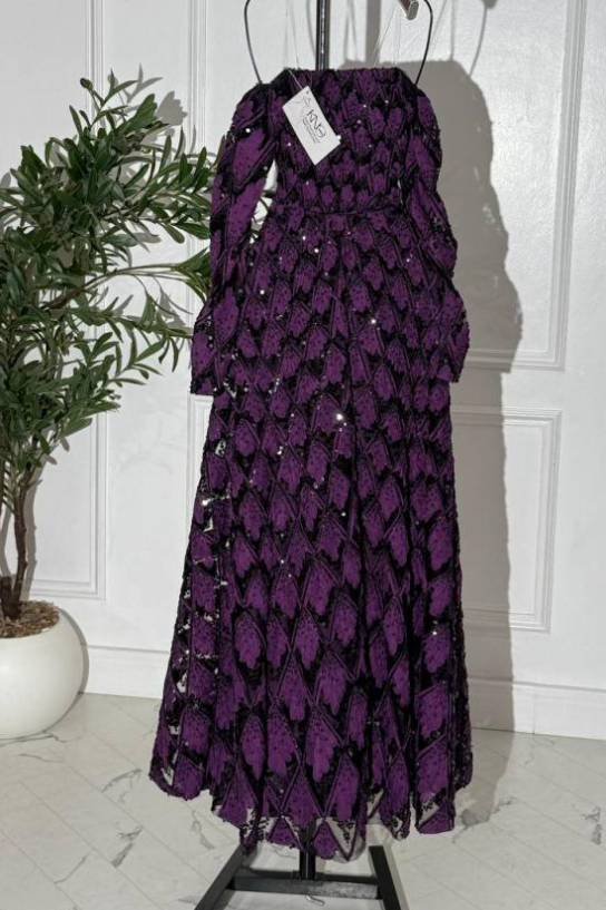 فستان سهرة بنفسجي كلفة فاخرة دانتيل تل وفصوص