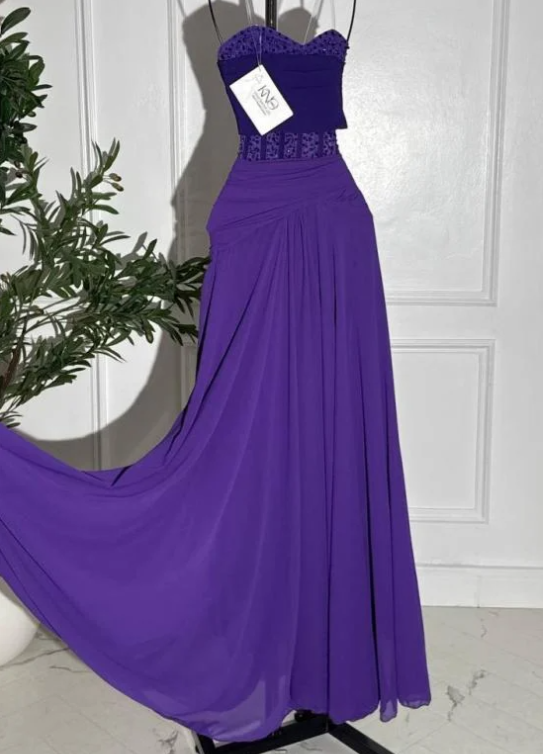 تجدين تفاصيل فستان سهرة بنفسجي بدون أكمام تخبرك أنك أميرة الحفل، وذلك للأسباب التالية: