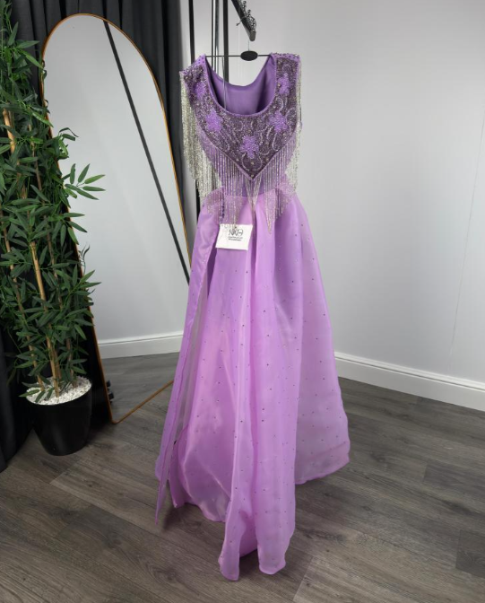 فستان سهرة بنفسجي مطرز بشراشيب فضية فاخرة
