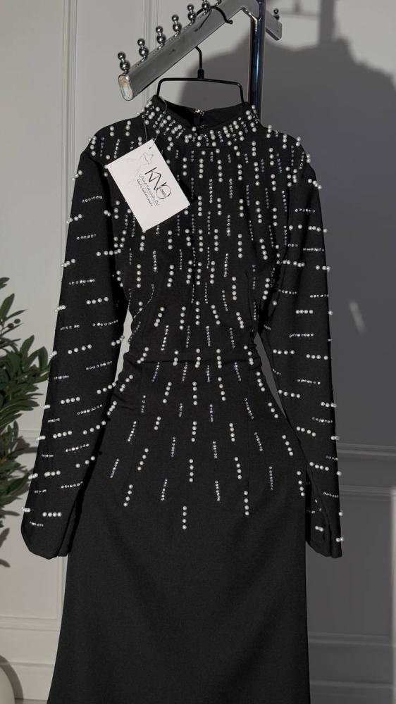 فستان اسود بأكمام طويلة مع لول و فصوص