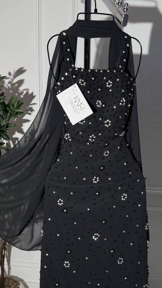 مصنوع من قماش جورجيت فاخر مزين بتطريزات من اللؤلؤ والفصوص اللامعة بتوزيع متناسق.