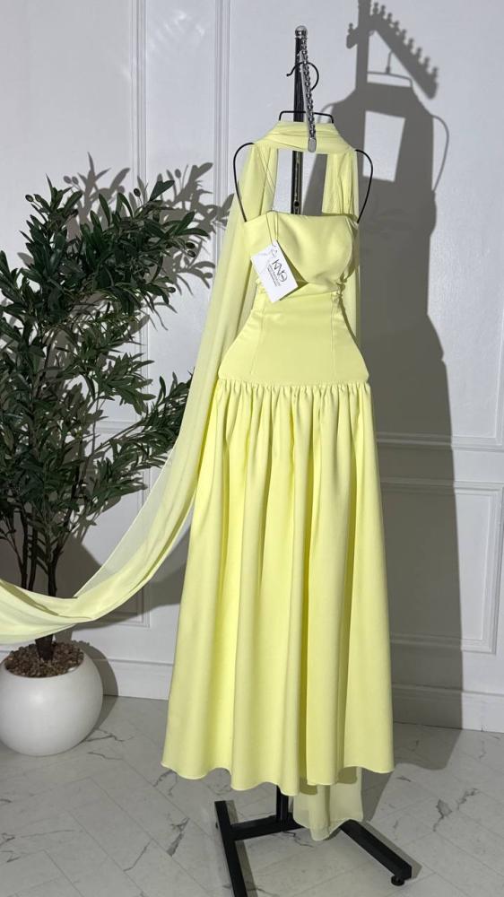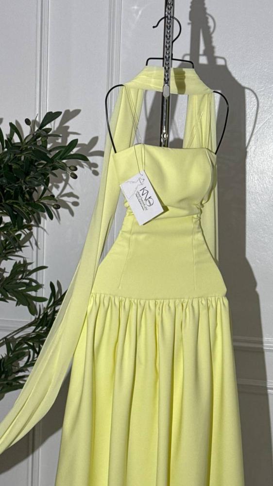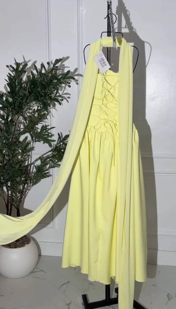 فستان اصفر مخصر بحبال من الخلف مع شال