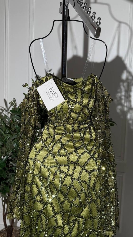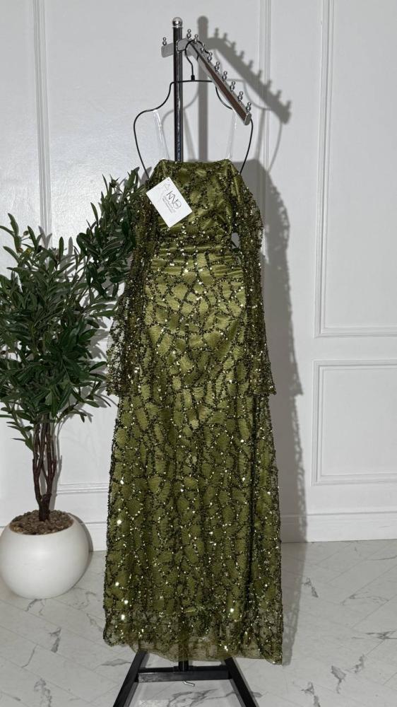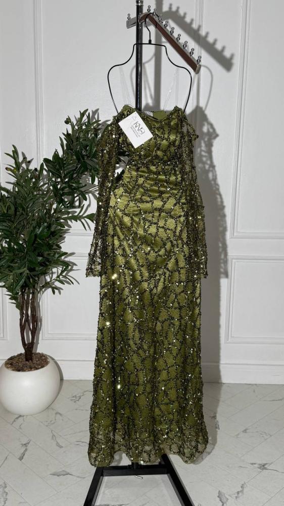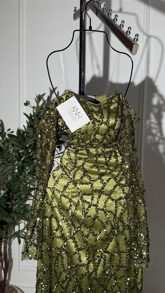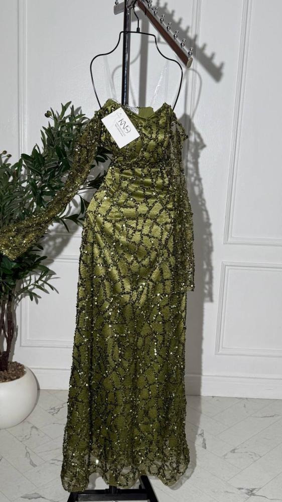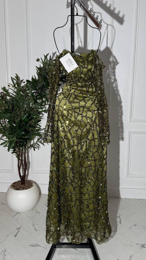 • فستان تفته مع تل فاخر مطرز بالشك، بلون مميز يشع فخامة ويمنح إطلالة راقية تخطف الأنظار.