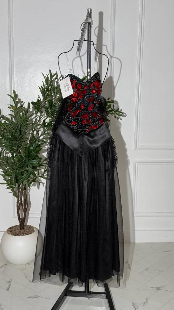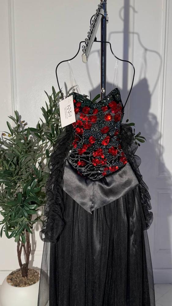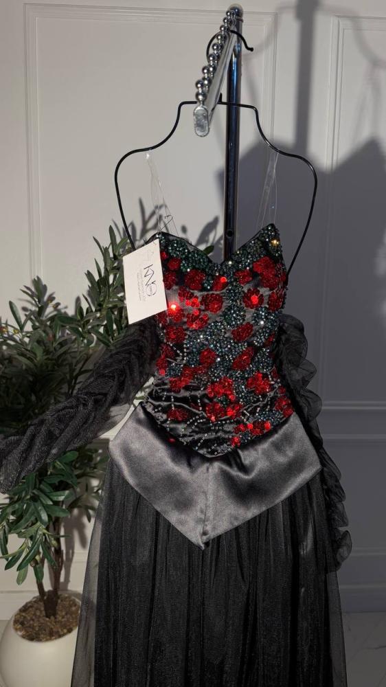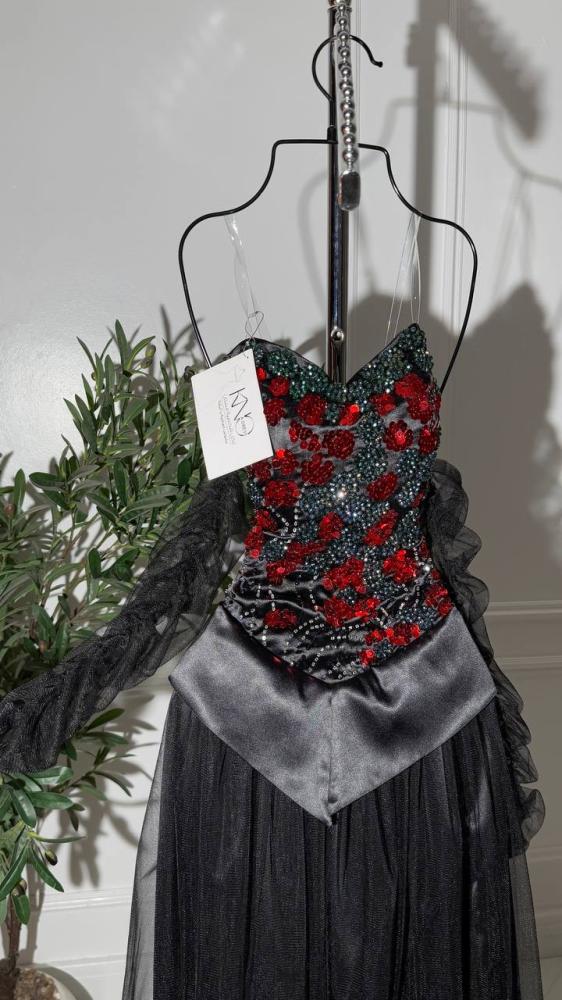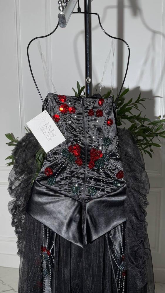 • فستان فاخر مصنوع من خامة التل والتفته بتصميم أنثوي راقٍ، يزدان بتطريز يدوي مباشر يبرز أدق التفاصيل بأسلوب فني متقن. يتميز بخاماته الفاخرة التي تجمع بين خفة التل ولمعة التفته ليمنح إطلالة ملكية أنيقة تلفت الأنظار