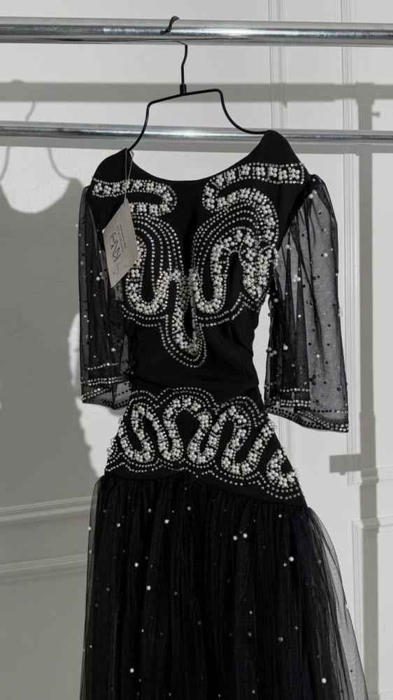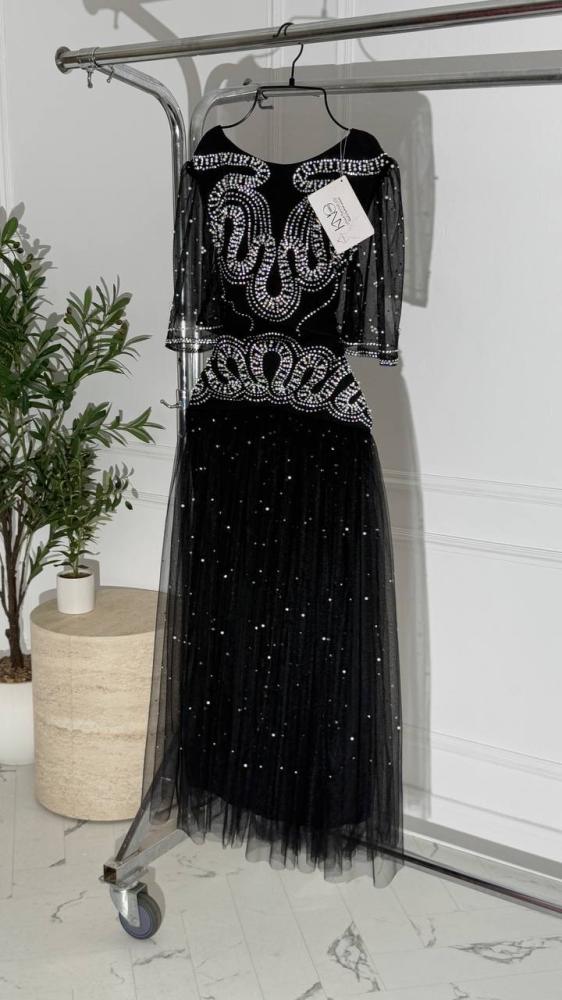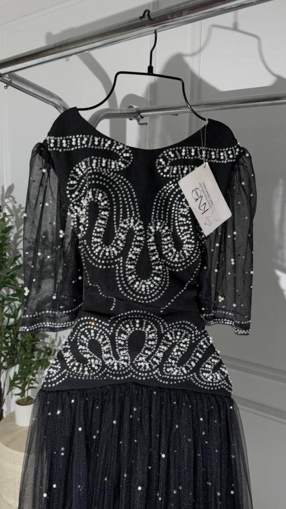 فستان فاخر بطول 53 إنش مصنوع من قماش الباربي الناعم مع طبقات من التل الخفيف، مزين بفصوص براقة وحبات اللؤلؤ، مما يمنحه لمسة أنثوية أنيقة وفخامة تناسب المناسبات الراقية والسهرات.