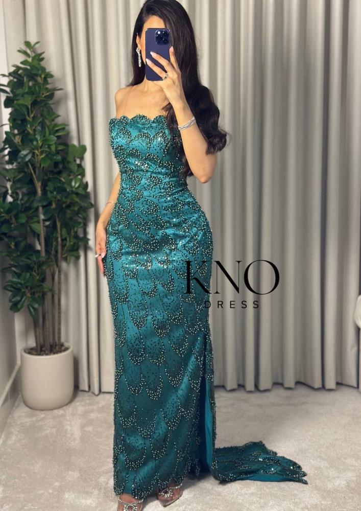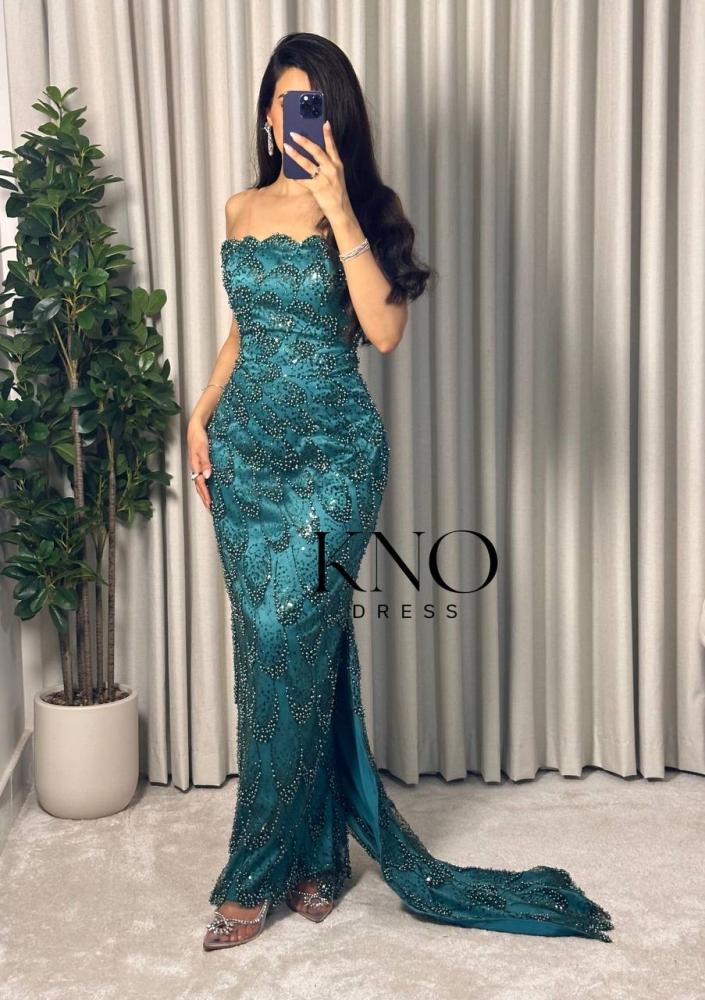 فستان سهرة لول و خرز مموج مبطن تفته