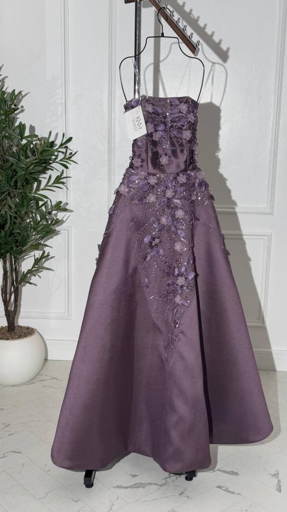 فستان يخطف الأنفاس بجماله المترف، بلون الأرجوان الملكي الذي ينبض أناقة وغموضاً. صُمم ليكون أكثر من مجرد فستان، بل قصيدة مطرّزة بالأنوثة والرقي