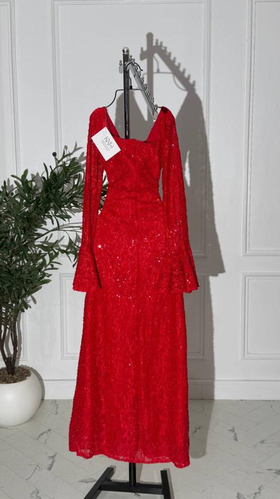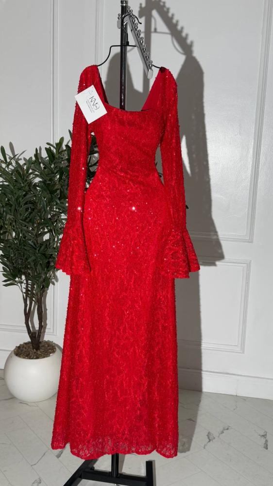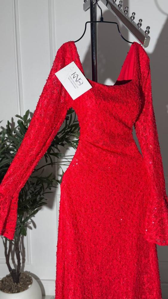 فستان سهرة أحمر طويل واكمام طويلة دانتيل فاخر مع خرز ورود