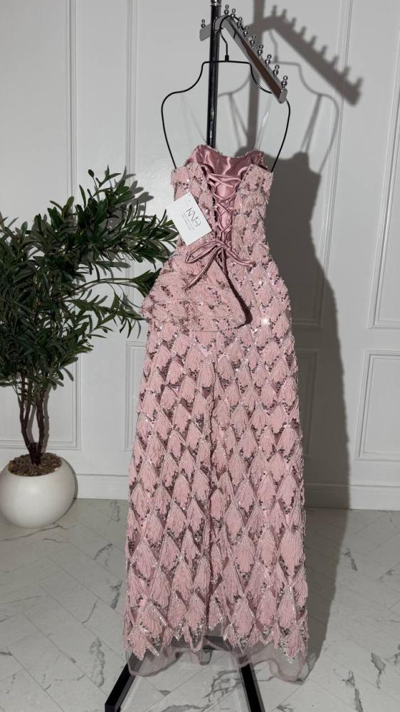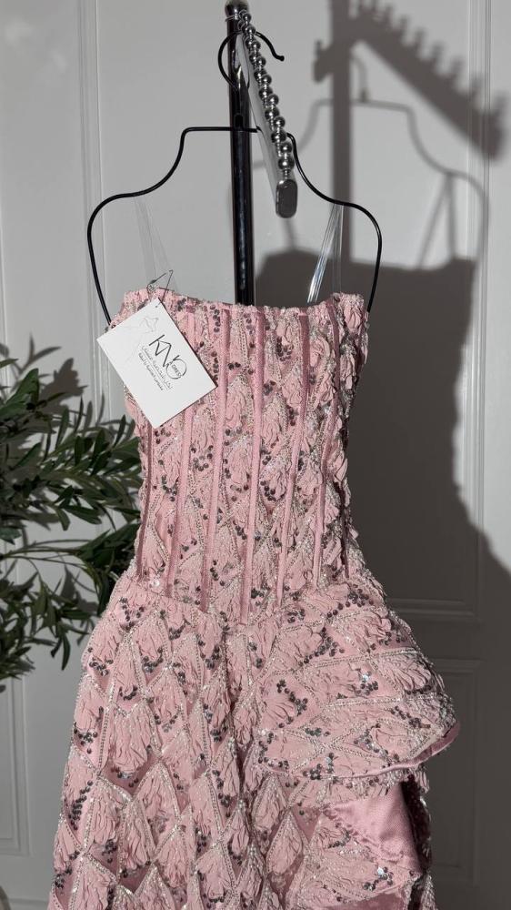 • اللون والتصميم: لون وردي هادئ بلمسة ترابية راقية. يتميز الفستان بتصميمه الفريد الذي يجمع بين جزء علوي على هيئة مشد (كورسيه) بدون حمالات، وتنورة طويلة بقصة مستقيمة.