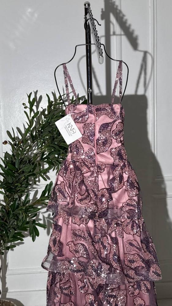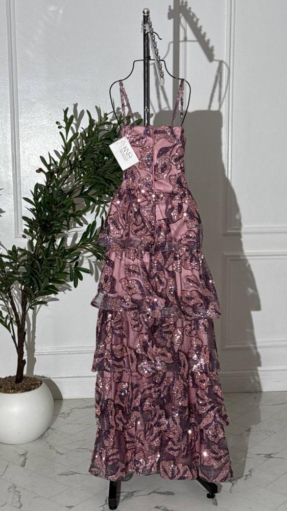 • فستان أنيق مصنوع من خامة شك فاخر بتفاصيل براقة تلفت الأنظار، يتميز بتصميمه الطبقي الكلوش الذي يمنحه حجماً فخماً وحركة انسيابية راقية. يضفي الشك اللامع لمسة من الفخامة والجاذبية، ليكون خياراً مثالياً للمناسبات الفاخرة والسهرات المميزة