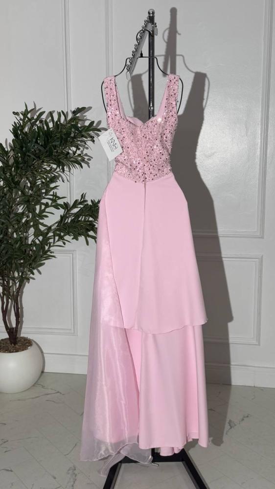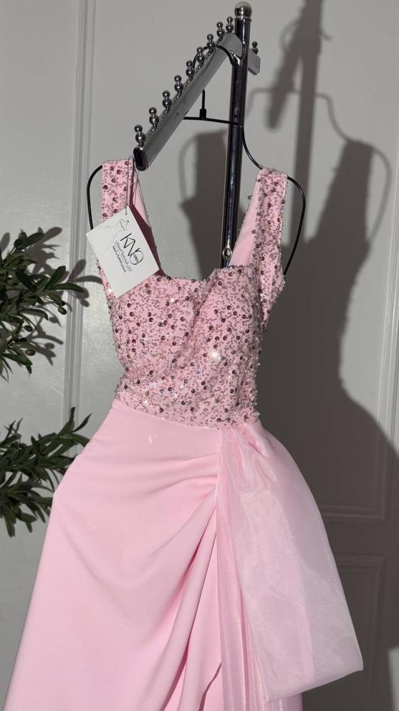 فستان وردي أنثوي بطول 58 إنش: يتميز بقصة ناعمة وانسيابية تضيف لمسة رقي وأناقة مثالية للمناسبات.