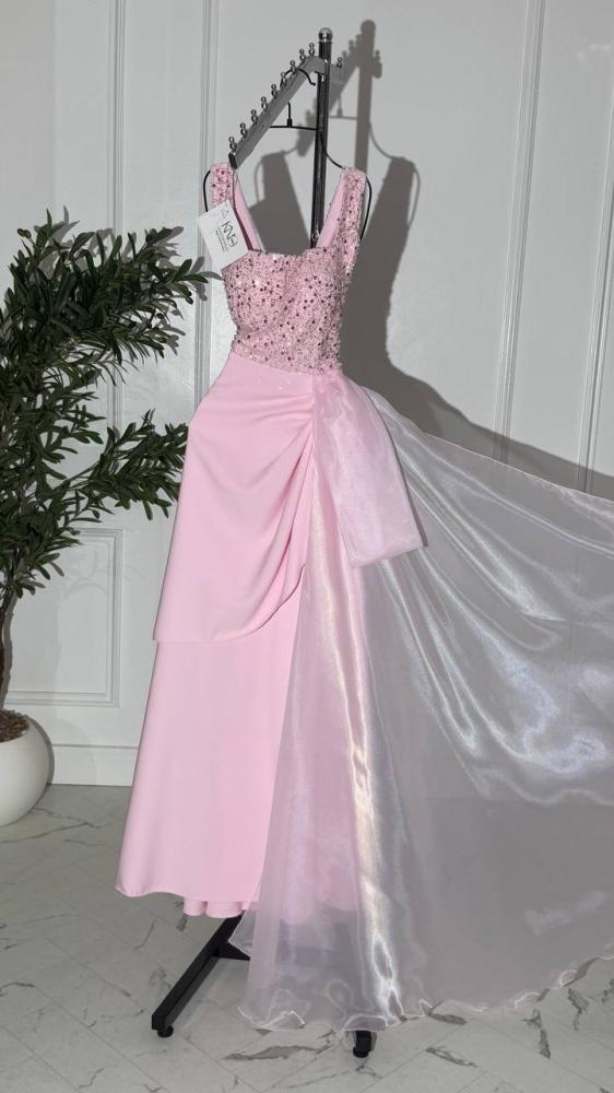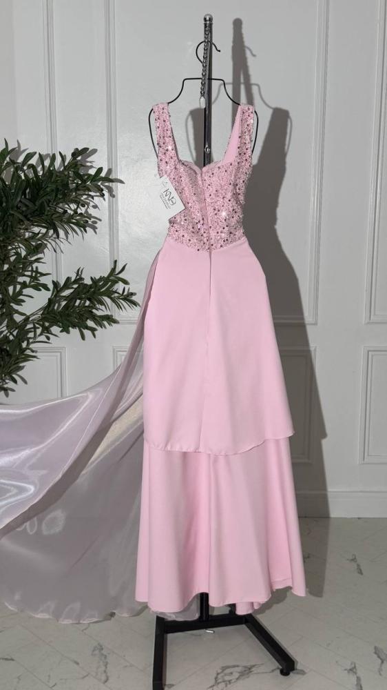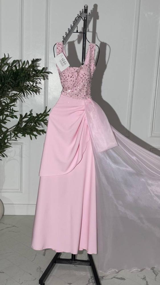 قماش باربي مع ذيل لامع: الخامة ناعمة ومريحة، ويكملها ذيل جانبي شفاف يضفي حركة ساحرة ولمسة ملكية