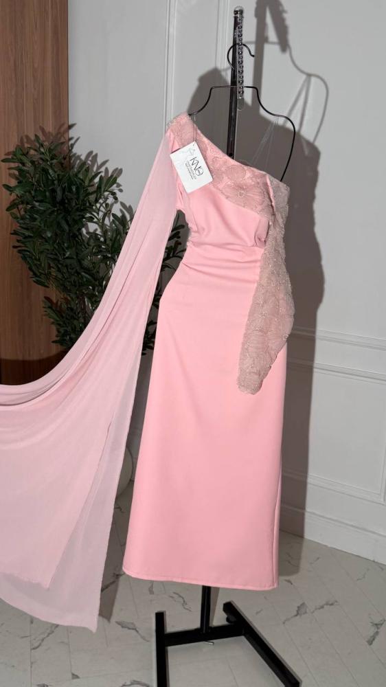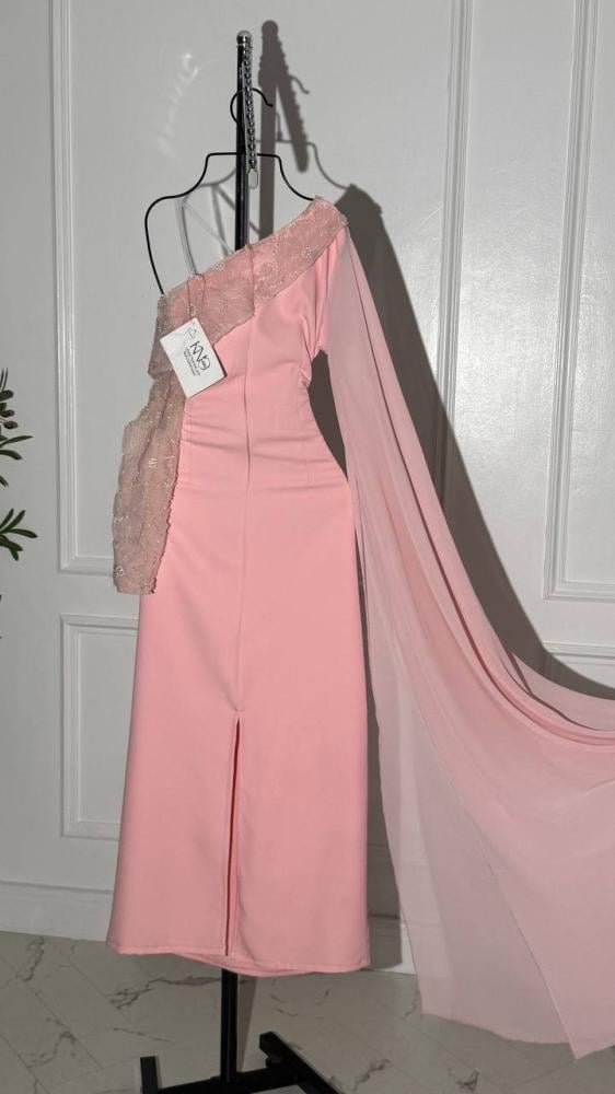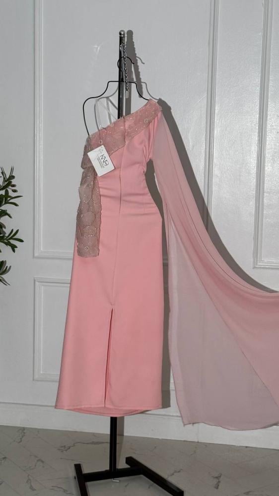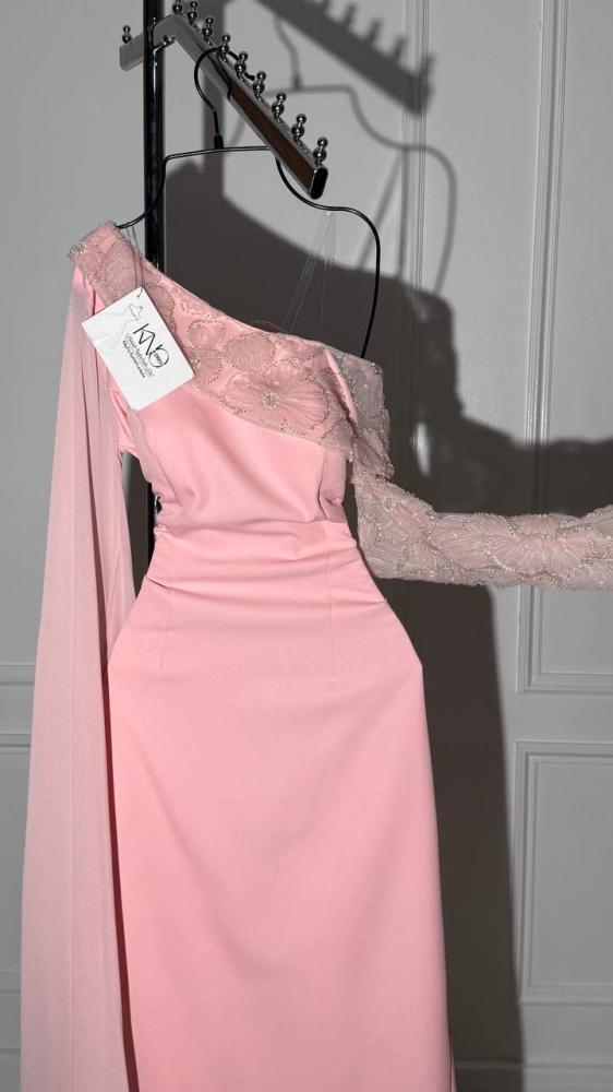 فستان وردي ب كم طويل مع ورود