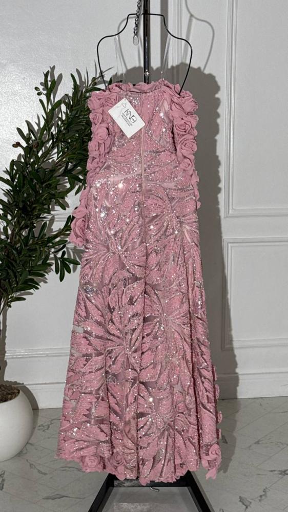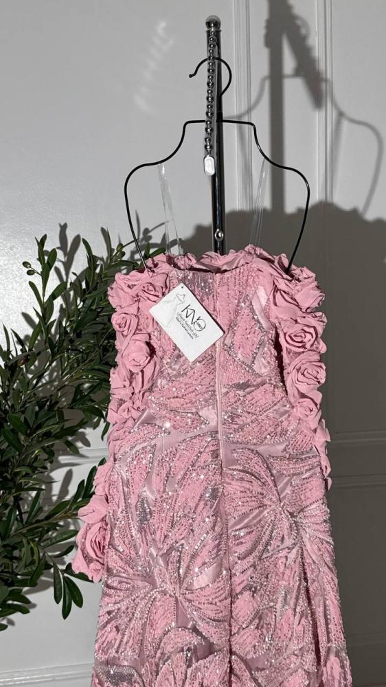 • فستان فاخر باللون الوردي، مصنوع من خامة الشك الفاخرة التي تتألق ببريقها الناعم، مزين بورود بارزة تضيف لمسة أنثوية راقية ولمعانًا جذابًا. تصميمه يجمع بين الفخامة والرقة ليمنح إطلالة حالمة تليق بالمناسبات الراقية والسهـرات المميزة